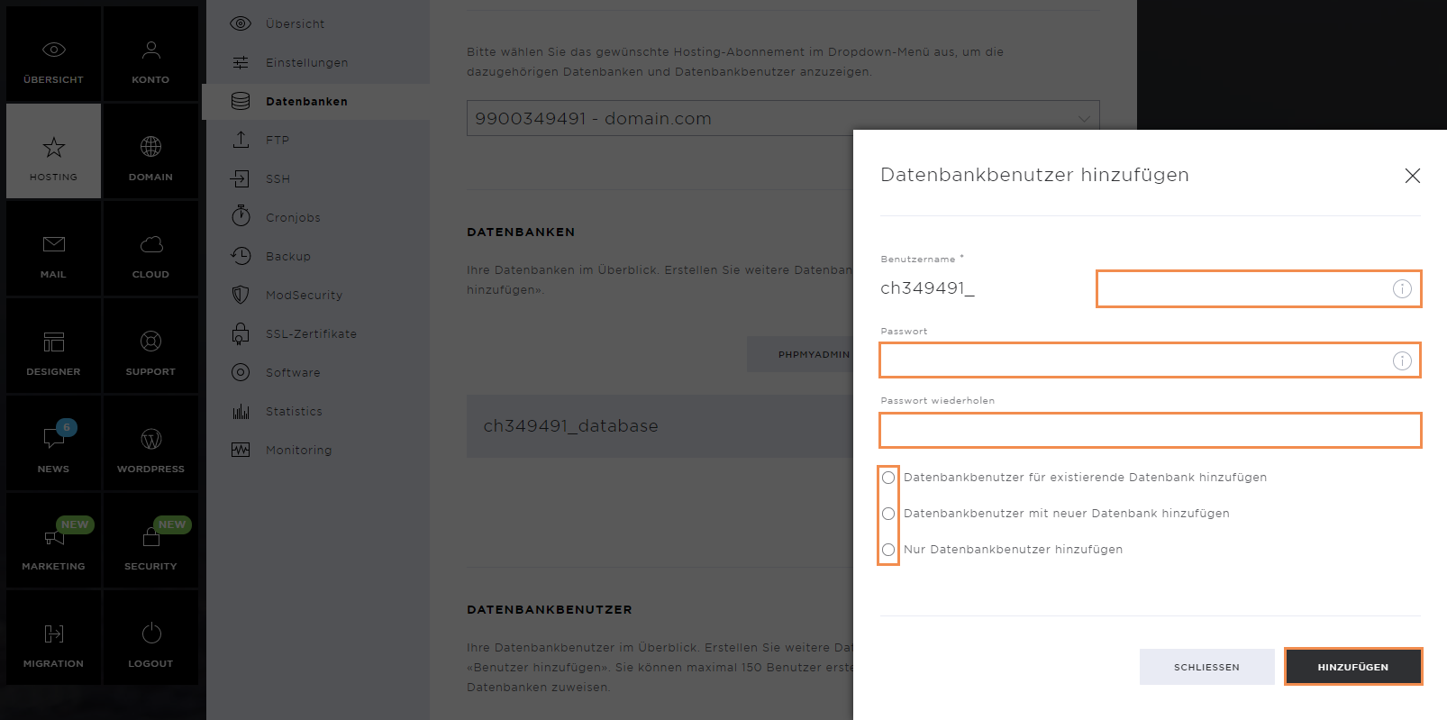 Definiere nun den Namen und das Passwort des neuen Datenbankbenutzers. Du kannst dem Benutzer bereits während der Erstellung eine Datenbank zuweisen, er kann jedoch auch ohne Datenbankzuweisung erstellt werden.