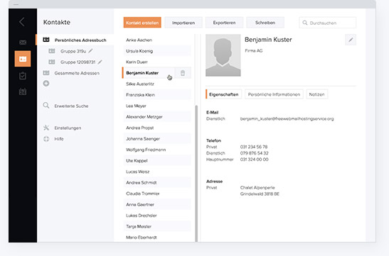 Une base de données d’adresse correctement gérée permet de gérer plus facilement la correspondance personnelle et commerciale. La gestion des contacts étendue et clairement structurée du service Messagerie vous permet de trouver le correspondant recherché en un rien de temps, même lorsque vos contacts sont nombreux et complexes. Plusieurs listes d’adresse, la prise en charge de vCard et le classement simple des contacts facilitent leur gestion.